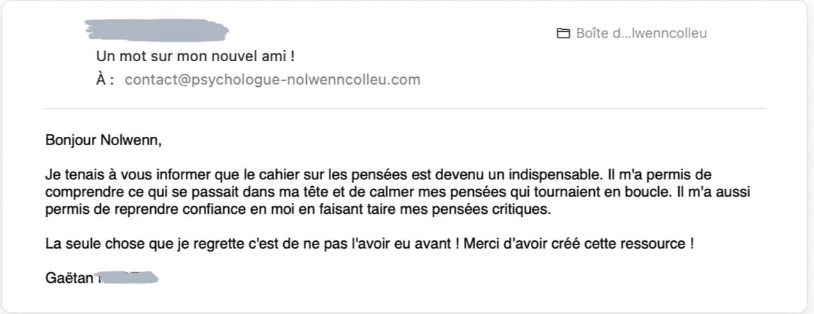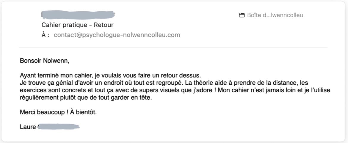 Aucun problème ! Vous pouvez m’écrire directement à l'adresse indiquée pour que je vous aide à choisir la ressource la plus adaptée à votre besoin actuel : contact@psychologue-nolwenncolleu.com