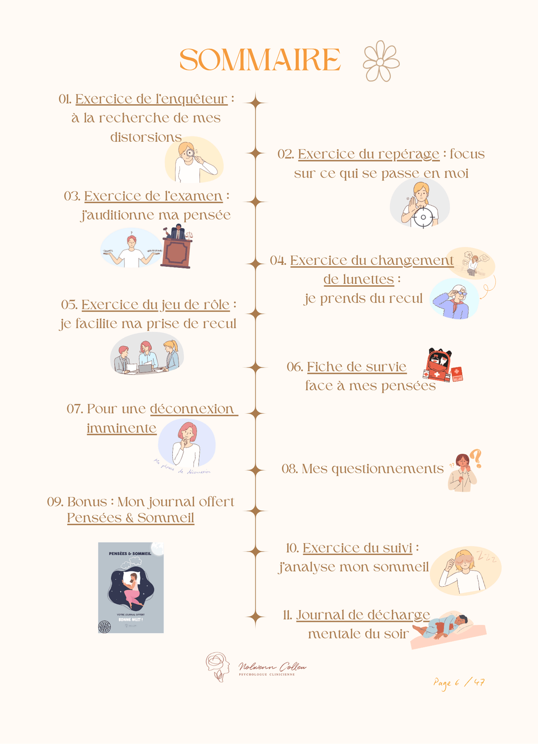Il est normal d’avoir des pensées qui s’enchaînent, surtout en période de stress ou de fatigue. Mais lorsque ces pensées deviennent envahissantes, elles peuvent générer de l’anxiété ou empêcher de se reposer. Ce cahier vous aide à comprendre ce qui se passe en vous et à retrouver de la clarté mentale.